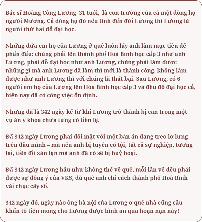 BS Hoàng Công Lương: Tôi nhớ vào ngày 23/4, tôi nhận được tin rằng phiên toà sơ thẩm vụ án của tôi đã ấn định ngày cụ thể. Người báo tin đó cho tôi đầu tiên không phải luật sư của tôi, cũng không phải TAND Tỉnh Hoà Bình mà là bác Nguyễn Thị Thu (mẹ của chị Thu Hằng, một trong tám bệnh nhân đã qua đời trong sự cố chạy thận – PV). Không dám gọi điện trực tiếp cho tôi, bác Thu đã báo tin qua chú ruột tôi, kèm một lời nhắn gửi: “Phải dặn Lương bình tĩnh nhé, đừng căng thẳng, đừng lo lắng, đừng sợ hãi…”.